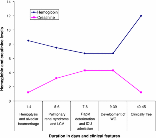 Pulmonary renal syndromes are rare but serious complications of systemic vasculitis. The majority of these cases are related to ANCA-associated vasculitis. These syndromes represent a combination of diffuse alveolar hemorrhage and rapidly progressive glomerulonephritis. Here we report a case of 21-year-old female with a clinical picture of community-acquired pneumonia that rapidly evolved to pulmonary hemorrhage and acute renal failure. Combined pulse steroid treatment, immunosuppressive treatment, and plasmapheresis were instituted and resulted in the improvement of the patient. The diagnosis of Wegener’s granulomatosis was established based on the clinical and serological findings (positive cANCA). Here we review the relevant literature on pulmonary renal syndromes associated with Wegener’s granulomatosis and discuss their diverse clinicopathologic features.