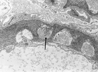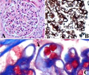 We report an unusual pathological finding, a large-sized bubbling appearance of the glomerular basement membrane (GBM), in a patient with pulmonary limited AL amyloidosis and a past history of lupus nephritis. The first renal biopsy specimen from 10 years ago, when systemic lupus erythematosus was diagnosed, demonstrated mild mesangial proliferation and subepithelial deposits (WHO classification: III + V). Light microscopy of the current biopsy using periodic acid methenamine silver (PAMS) stain demonstrated a large-sized bubbling appearance of the GBM; however, very weak immunoglobulin and complement deposition was observed in immunofluorescence studies. Routine electron microscopy demonstrated partial subendothelial expansion with electron-lucent materials, but no electron-dense deposits or amyloid fibrils. Electron microscopy with PAMS stain revealed electron-lucent endothelial scalloping, including some cellular components and microspheres in the GBM; however, it is not clear if these materials are derived from endothelial cells. One possibility is that these unique findings represent a recovery phase of lupus membranous nephritis; another is that these findings correspond to a new disease entity.