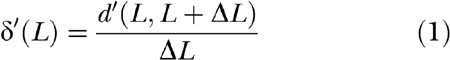 where L is in dB relative to a threshold reference value. It is easily verified that Weber’s Law predictions are obtained from a Poisson channel with this rate-level function. In this case δ′ is equal to a constant value [10√(4cT)] that is independent of L for levels above threshold. It follows that a near-miss prediction on a single Poisson channel requires a rate-level function that grows faster than quadratically on a decibel level scale.