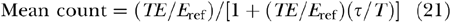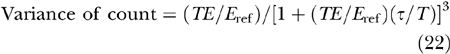 ref is a threshold constant, T is the duration, and τ is the dead time. If (δ′)2 is computed for a single channel with these statistics, one obtains
