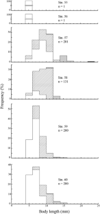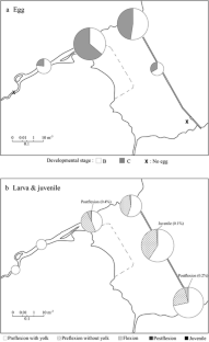 To examine reproduction of Coilia nasus, an engraulid endemic fish to Ariake Bay, in the freshwaters upstream of the reclamation dike of Isahaya inlet, ichthyoplankton was collected at the surface with a larva net. Eggs and larvae of this species were captured in abundance, especially in the retention basin. All eggs had reached middle or late embryonic stages, and larvae from the preflexion with yolk to the juvenile stage (4.1–39.3 mm) were found. This suggests that the freshwaters of retention basin supply spawning and nursery grounds for C. nasus.