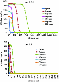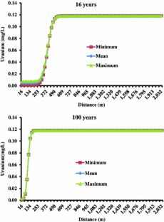 El impacto de un dique de colas de uranio sobre la calidad del agua subterránea fue estudiado por modelado geoquímico. Se tomaron muestras de agua subterránea desde seis pozos en el distrito Nalgonda, Andhra Pradesh, en el sur de India, una vez cada dos meses desde Marzo 2008 a Enero 2010 y analizadas para determinar Ca, Mg, Na, K, cloruro, sulfato, carbonato, bicarbonato y uranio. La predicción de la calidad del agua subterránea fue realizada para 100 años usando PHREEQC para determinar los efectos de infiltración desde el dique de colas propuesto. Se evaluó la sensibilidad del modelo ante variaciones en porosidad, gradiente hidráulico, conductividad hidráulica y concentración de uranio en las colas. Los modelos geoquímicos predicen que si la composición química del agua de las colas es mantenida en las concentraciones promedio esperadas y un revestimiento apropiado es instalado con una velocidad de infiltración ≤1,0 × 10−9 m/s, la concentración de solutos en el agua subterránea se incrementaría desde los presentes valores, en un gradiente descendente, hasta una distancia de 500 m durante la vida esperada de la mina, i.e. 16 años. El modelo predice que la concentración de iones en las aguas subterráneas excedería las concentraciones hasta un máximo de 100 m luego de 100 años. Este estudio fue usado para predecir la composición química óptima para las colas y la extensión, en términos de tiempo y distancia, a la que la concentración de varios iones en las aguas subterráneas sería incrementada por la infiltración de aguas desde los diques de cola.