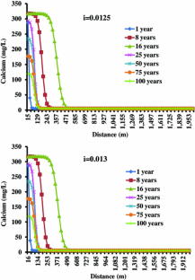 The impact of a proposed uranium tailings pond on groundwater quality was assessed by geochemical modelling. Groundwater samples were collected from six dug wells in the Nalgonda district, Andhra Pradesh, in southern India, once every 2 months from March 2008 to January 2010, and analysed for calcium, magnesium, sodium, potassium, chloride, sulphate, carbonate, bicarbonate, and uranium. Prediction of groundwater quality was carried out for 100 years using PHREEQC to assess the effects of infiltration of water from the proposed tailings pond. The sensitivity of the model for variations in porosity, hydraulic gradient, hydraulic conductivity, and concentration of uranium in the tailings was evaluated. Geochemical modelling predicts that if the chemical composition of the tailings water is maintained at about the expected mean concentrations, and an appropriate liner is installed with an infiltration rate ≤1.0 × 10−9 m/s, the concentration of solutes in the groundwater will be increased from present background levels for a down-gradient distance of up to 500 m for the anticipated life of the mine, i.e. 16 years. The concentration of ions in groundwater would exceed background concentrations for up to 100 m at the end of 100 years. This study was used to predict the optimum chemical composition for the tailings and the extent, in terms of time and distance, that the groundwater concentration of various ions would be increased by infiltration of wastes from the tailings pond.