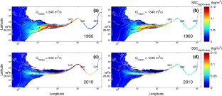 Donker JJ, de Swart HE (2013) Effects of bottom slope, flocculation and hindered settling on the coupled dynamics of currents and suspended sediment in highly turbid estuaries, a simple model. Ocean Dyn 63:311–327