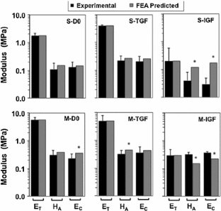 A continuum mixture model with distinct collagen (COL) and glycosaminoglycan elastic constituents was developed for the solid matrix of immature bovine articular cartilage. A continuous COL fiber volume fraction distribution function and a true COL fiber elastic modulus (\(E^\mathrm{f})\) were used. Quantitative polarized light microscopy (qPLM) methods were developed to account for the relatively high cell density of immature articular cartilage and used with a novel algorithm that constructs a 3D distribution function from 2D qPLM data. For specimens untreated and cultured in vitro, most model parameters were specified from qPLM analysis and biochemical assay results; consequently, \(E^\mathrm{f}\) was predicted using an optimization to measured mechanical properties in uniaxial tension and unconfined compression. Analysis of qPLM data revealed a highly anisotropic fiber distribution, with principal fiber orientation parallel to the surface layer. For untreated samples, predicted \(E^\mathrm{f}\) values were 175 and 422Â MPa for superficial (S) and middle (M) zone layers, respectively. TGF-\(\upbeta \)1 treatment was predicted to increase and decrease \(E^\mathrm{f}\) values for the S and M layers to 281 and 309Â MPa, respectively. IGF-1 treatment was predicted to decrease \(E^\mathrm{f}\) values for the S and M layers to 22 and 26Â MPa, respectively. A novel finding was that distinct native depth-dependent fiber modulus properties were modulated to nearly homogeneous values by TGF-\(\upbeta \)1 and IGF-1 treatments, with modulated values strongly dependent on treatment.