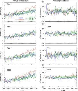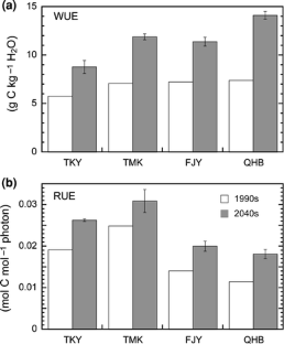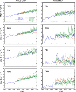 Using a process-based model, I assessed how ecophysiological processes would respond to near-future global changes predicted by coupled atmosphere–ocean climate models. An ecosystem model, Vegetation Integrative SImulator for Trace gases (VISIT), was applied to four sites in East Asia (different types of forest in Takayama, Tomakomai, and Fujiyoshida, Japan, and an Alpine grassland in Qinghai, China) where observational flux data are available for model calibration. The climate models predicted +1–3°C warming and slight change in annual precipitation by 2050 as a result of an increase in atmospheric CO2. Gross primary production (GPP) was estimated to increase substantially at each site because of improved efficiency in the use of water and radiation. Although increased respiration partly offset the GPP increase, the simulation showed that these ecosystems would act as net carbon sinks independent of disturbance-induced uptake for recovery. However, the carbon budget response relied strongly on nitrogen availability, such that photosynthetic down-regulation resulting from leaf nitrogen dilution largely decreased GPP. In relation to long-term monitoring, these results indicate that the impacts of global warming may be more evident in gross fluxes (e.g., photosynthesis and respiration) than in the net CO2 budget, because changes in these fluxes offset each other.