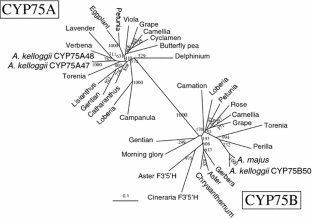 Seitz C, Eder C, Deiml B, Kellner S, Martens S, Forkmann G (2006) Cloning, functional identification and sequence analysis of flavonoid 3′-hydroxylase and flavonoid 3,5′-hydroxylase cDNA reveals independent evolution of flavonoid 3′,5′-hydroxylase in the Asteraceae family. Plant Mol Biol 61:365–381