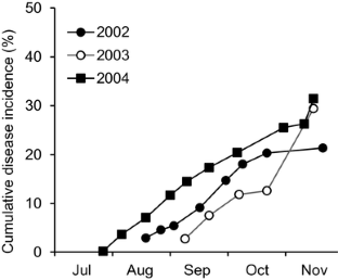 Nekoduka S, Hada H, Iwadate Y, Ishiguro K (2009) A nested case-control study on disease severity of Alternaria blotch of apple at early and late phases of epidemics (in Japanese with English summary). Jpn J Phytopathol 75:314–322