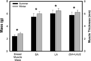 Changes in flight muscle size are important mediators of phenotypic flexibility in birds, so the ability to track such changes over time in individual birds is a valuable tool for investigating phenotypic flexibility. Ultrasonography has been used to track changes in flight muscle size in shorebirds, but has not been previously used to track such changes in small birds, despite variation in flight muscle size being an important contributor to phenotypic flexibility in these birds. One prominent avian example of phenotypic flexibility is the seasonal phenotypes of small birds in response to climatic variation. The winter phenotype in these birds is characterized by increases in organismal metabolic rates and pectoralis muscle mass. We measured seasonal flight muscle size in House Sparrows (Passer domesticus, 25–30 g) using both ultrasonography and wet muscle mass and tested the correlation between ultrasonographic measures of breast muscle thickness and muscle mass. We further tested whether ultrasonographic measures of muscle thickness were sufficiently precise to detect seasonal variation in flight muscle mass. Muscle mass was significantly and positively associated with ultrasonographic measurements of breast muscle thickness for short-axis (SA), long-axis (LA), and combined SA and LA measurements. Breast muscle mass was significantly greater in winter than in summer (17.5 %) and muscle thickness also increased significantly in winter for both SA (9.1 %) and LA (7.5 %) measures. Thus, these data confirm that winter elevations of flight muscle mass consistently contribute to the winter phenotype in House Sparrows and that ultrasonography is effective in detecting seasonal changes in muscle mass in small birds.