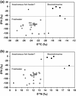 Graham CT, Harrison SSC, Harrod C (2014) Differences the contributions of dietary water to the hydrogen stable isotope ratios of cultured Atlantic salmon and Arctic charr tissues. Hydrobiologia 721:45–55