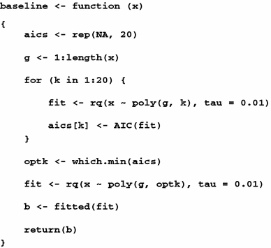 A standard polynomial regression for quantile 0.01: rq(y ~ poly(x, degree), τ = 0.01) with monitoring the AIC value. The degree with lowest AIC was fitted finally and treated as baseline