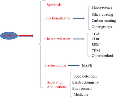 Magnetic molecularly imprinted polymers (MMIPs) have attracted considerable attention in recent years as multifunctional materials suitable for use in the separation and purification fields. When modified with a specific functional polymer, MMIPs can be used to extract chemicals from a matrix and concentrate them based on specific recognition features, enabling more convenient retrieval of analytes using an external magnetic field. This review covers the preparation, characterization, and applications of various MMIPs, with particular focus on the technique used to coat such MMIPs with functional groups. A comprehensive overview of the applications of MMIPs to electrochemistry, food, and environmental analysis, and medicine is also presented. Furthermore, the problems and trends associated with MMIP-based applications are discussed.