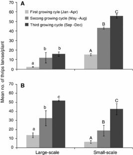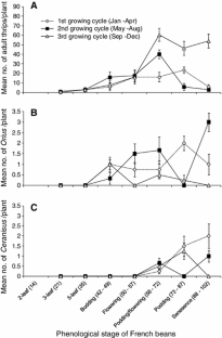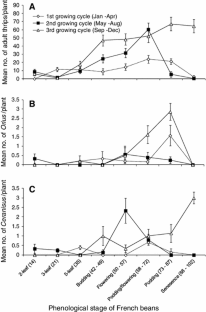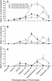 The seasonal abundance of western flower thrips (WFT) [Frankliniella occidentalis (Pergande) (Thysanoptera: Thripidae)] and its natural enemies on French beans in two agro-ecological zones (AEZs) (high and mid altitude) in Kenya, was studied in three growing cycles from January to December 2009. French beans were sampled every 2 weeks for WFT and natural enemies. Results show that colonization of French beans with WFT in both farm scales studied in the two AEZs started at 2- to 3-leaf stage. There was an increase in the population density of WFT from budding stage to podding/flowering stage, and it declined at crop senescence. The population densities of WFT on French beans were lower in the first compared with the second growing cycle and the highest in the third growing cycle. Two natural enemies of thrips, Orius spp. (Hemiptera: Anthocoridae) and Ceranisus menes (Walker) (Hymenoptera: Eulophidae), were recorded on French beans. The population density of C. menes was positively correlated with thatof WFT, while the population densities of Orius spp. and WFT were not correlated. The population density of WFT was not correlated with temperature and relative humidity, but was negatively correlated with rainfall. Our results suggest that the population density of WFT in the two AEZs differs along growing cycles and plant phenological stages. Management strategies targeted at WFT would need to start at early crop stages (3-leaf to budding stage), depending on growing cycle, to prevent further build-up of thrips population.