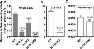 Spit J, Philips A, Wynant N et al (2017) Knockdown of nuclease activity in the gut enhances RNAi efficiency in the Colorado potato beetle, Leptinotarsa decemlineata, but not in the desert locust, Schistocerca gregaria. Insect Biochem Mol Biol 81:103–116. https://doi.org/10.1016/j.ibmb.2017.01.004