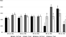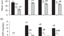 The number of surviving larvae and the number of larvae that have been consumed (cannibalism and intraguild predation) from either experiment 1 or experiment 2 were analysed using a generalized linear model (GLM) with negative binomial regression procedure. Significant differences were separated using Tukey’s multiple comparison test performed using the R package “lsmeans” (Lenth 2016). The relative growth rate (RGR) of the larvae from the two experiments was analysed using Kruskal–Wallis nonparametric procedure with dunn.test R package after being tested for normality and homogeneity of variance using Shapiro–Wilk and Bartlett tests, respectively. All analyses were performed with R software version 3.5.1 (R Core Team 2018).