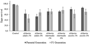 Considering that some bioactive compounds are more soluble in ethanol than in water, we tried to evaluate the bioactivity of the ethanolic extracts of Alibertia edulis, Alibertia intermedia and Alibertia sessilis leaves at concentrations of 1 and 3% on the biological characteristics of parental and F1 generations of Plutella xylostella (Linnaeus, 1758) (Lepidoptera: Plutellidae). Thus, the ethanolic extracts of Alibertia edulis, Alibertia intermedia and Alibertia sessilis were tested on the biological characteristics of P. xylostella in the parental generation and their effects on the F1 generation. In general, the species tested showed significant results on the biological characteristics of P. xylostella. Pupal weight was affected by all plant species. A. edulis extracts reduced egg survival on the parental and F1 generation of P. xylostella while in F1 generation reduced the longevity of females. Larval duration, pupal weight and survival of eggs on parental generation were reduced by A. intermedia extracts.