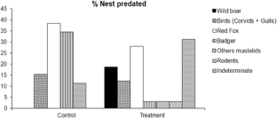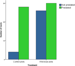 The wild boar has, over the past few decades, undergone an expansion in Europe, which may have negatively affected ground-nesting bird populations and particularly those of wading birds. The aim of this study was to evaluate predation on waders’ nests by wild boar in Sweden, where this species has been increasing since its reintroduction. This was done by placing artificial nests in seven different study areas. A comparison was then made of predation rates of the nests placed on control plots (areas in which no wild boar were present but other predators were) and plots containing different abundances of wild boar. Contrary to our expectations, the proportion of nests predated was significantly lower in those areas in which wild boar were present, with a predation rate of 54 %, whereas the predation rate was 87.5 % in the others. The wild boar was identified as the second most important nest predator in the plots in which it was present, accounting for 18 % of the predated nests. The main predator on both types of plots was the red fox, which was responsible for 28 and 38.5 % of the predated nests on plots with/without wild boar, respectively. Interestingly, predation by badgers occurred principally in areas in which the wild boar was absent (34.5 % of the predated nests), whereas only one nest was predated by this predator in areas containing wild boar. It is not, however, possible to state whether predation by badgers was lower because of the presence of wild boar or whether this was owing to the fact that badgers do not select those particular patches because of habitat features.
