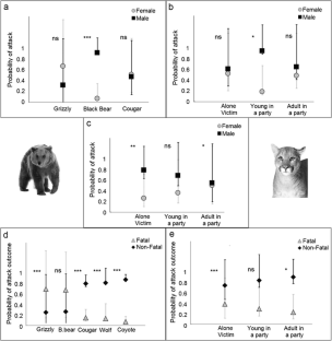 Wildlife managers, researchers and the general public have traditionally been demanding information on factors concerning the probability of risky encounters between predators and people, as well as how to react in those situations. This information is crucial to reduce the number of predator attacks, which in absolute terms have increased in the last decades. Here, we focus on the role of carnivore species and sex, as well as victim-related factors (i.e. gender, activities, party composition), as determinants of carnivore attacks on humans. Using a dataset on attacks by grizzlies (Ursus arctos horribilis), black bears (Ursus americanus), cougars (Puma concolor), wolves (Canis lupus) and coyotes (Canis latrans) in North America during the last five decades, we found that (1) male black bears were involved in attacks more frequently than females; (2) attacks by coyotes, cougars and wolves prevalently caused injuries, whereas cases of death were more frequent during grizzly and black bear attacks; and (3) people in a party were less vulnerable to an attack than a person alone. We identified risky situations and behaviours that should be avoided in areas where people and large carnivore share the landscape.