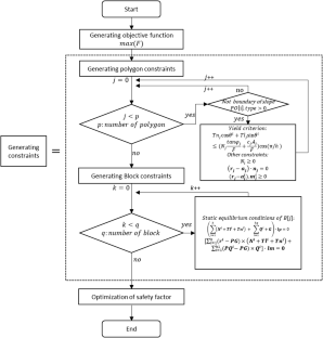 In this paper, a 3D slope stability analysis method is proposed based on the Pan’s maximum principle and under the framework of the limit equilibrium method. In the proposed method, the slope is discretized into a 3D block system. The magnitudes, directions, and acting points of the inter-block forces were considered as unknown variables. Based on the Pan’s maximum principle, a statically admissible stress field that satisfies the static equilibriums (force and moment equilibriums) and yield criteria for slope materials is used as constrained conditions and the maximum factor of safety (Fmax) is used as the optimization objective. Then, a nonlinear programming solver is used to solve the maximum safety factor. The proposed method is applied to four numerical examples, and the accuracy and reliability of this method are verified. This method can offer rational results and is of great feasibility in 3D slope stability analysis.