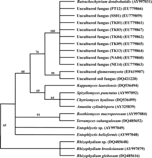 Morehouse EA, James TY, Ganley ARD, Vilgaly R, Berger L, Murphy PJ, et al. (2003) Multilocus sequence typing suggests the chytrid pathogen of amphibians is a recently emerged clone. Molecular Ecology 12:395–403.