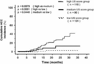 The annual incidence of HCC was 1.1, 5.5, and 10.2% in low, middle, and high US score groups, respectively. Univariate analysis showed that age, serum levels of total bilirubin, alpha-fetoprotein (AFP), platelet count, albumin, total cholesterol, and the US score were associated with HCC occurrence in the patients. A multivariate proportional hazard model revealed that only the middle and high US scores (p = 0.0922, hazard ratio 4.006, 95% CI 0.796–20.153 and p = 0.008, hazard ratio 7.991, 95% CI 1.721–37.10, respectively) and elevated AFP (p = 0.031, hazard ratio 2.774, CI 1.097–7.014) were independently associated with HCC occurrence. Our US scoring based on evaluation of the liver surface, edge, and texture was clearly and strongly associated with the occurrence of HCC in patients with HCV-associated CLDs, and with the higher occurrence rate of HCC in patients with higher US scores
