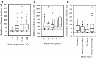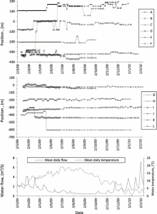 The movements and habitat use of resident yellow eels were studied in a stream stretch having both natural and minimum flow zones. N = 12 individuals (total length 505–802 mm) were surgically tagged with radio transmitters and released at their capture sites. They were located using manual radio receivers during the daytime from 2 to 5 days/week over periods ranging from 200 to 329 days, for a total of 1,098 positions. Eels showed home ranges ranging from 33 to 341 m (median value, 62 m), displayed strong fidelity to sites and demonstrated a great degree of plasticity in habitat use. Eels were slightly mobile throughout the year, but their movements were season and temperature dependent, with a maximum during the spring (mean water temperature, 12 °C) and a minimum in winter (3 °C). Stones and roots (utilization rate greater than 50 % of eels for more than 30 % of location days) were significantly the most frequently used habitats. Between the two flow zones, the natural flow was the most occupied, with a significantly higher proportion of resident eels (66.7 % of radio-tagged yellow eels) and longer occupation (81 % of location days) than the minimum flow zone with less suitable habitats.