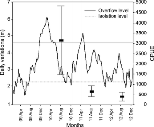 Temporal variations of fish abundance and species richness in two sites of a secondary channel of the Middle Paraná Floodplain (Argentina) have been analyzed from 2010 to 2012. Relationships of these ecological attributes with alternations of floods and dry periods were appraised. Permutational analyses of variance were applied to determine significance in temporal changes of the fish community, taking into account catch per unit effort and species richness of the whole community, by groups of distinct reproductive strategy and considering fish sizes. The results reveal significant differences in structure and composition of fish assemblages at distinct stages of the hydrological regime. Those temporal differences are associated with changes in timing, duration, and magnitude of floods since the three groups have shown distinct responses to the hydrological variations. Long-distance migrants depend on major inundations for a successful reproduction, short-distance migrants seem to have distinct responses to floods according to the kind of species, and sedentary fish-developing parental care essentially needs high floodplain connectivity for juvenile development.