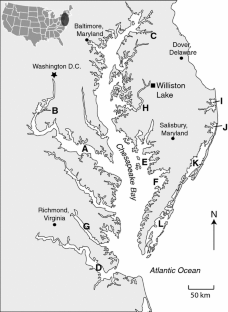 Saxby T (2003) USA, MD, VA: Chesapeake Bay (2003) [line map][no scale provided]. Integration and Application Network, University of Maryland Center for Environmental Science. Retrieved from http://ian.umces.edu/imagelibrary/displayimage-search-0-5833.html