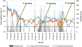 Tree pruning is an important tree management option for reducing shading effects and altering whole-tree water use in smallholder farming systems. In this study, sap flow meters (SFM1s) were used to monitor whole- tree water use in Cordia africana (Cordia), Albizia coriaria (Albizia) and Coffea arabica (coffee) trees in two farms in Eastern Uganda. Overstory trees were subjected to a 50% pruning regime at a 6-month interval over a period of 20 months (July 2018–February 2020). Analysis of variance General Linear Model was performed to assess the influence of tree species, management, season and their interaction on mean daily sap flow. Pairwise Pearson correlation coefficients between daily sap flow and leaf phenology were also obtained. Pruning altered the synchrony in the vegetative phenology of Albizia trees, as leaf cover changes occurred earlier in pruned trees than in unpruned trees. Pruned Cordia and Albizia trees respectively used 22.8% and 50.1% less water than unpruned trees whose average daily water use was 76.5L day−1 and 133.7L day−1 respectively. Episodes of reverse flows were observed in Albizia trees (pruned and unpruned) and the pruned Cordia during certain periods of the year. There was a statistically significant main effect of tree species, pruning, season and their interaction on daily tree water use (P < 0.05). Coffee used 0.1 to 4.3 L of water per day over the 20-month period. While unshaded coffee used more water than shaded coffee, coffee growing under pruned trees used more water than coffee under unpruned trees. This could have resulted from more transpiration pull in coffee resulting from increased radiation with reduced shading. Subsequently, canopy pruning reduced the water demand of the tree component and resulted in recharge in the crop-rooting zone, although this seemed to appear later following consistent pruning. The study findings demonstrate that agroforestry tree canopy pruning can regulate water use in smallholder agroforestry systems, the benefits of other tree products notwithstanding.