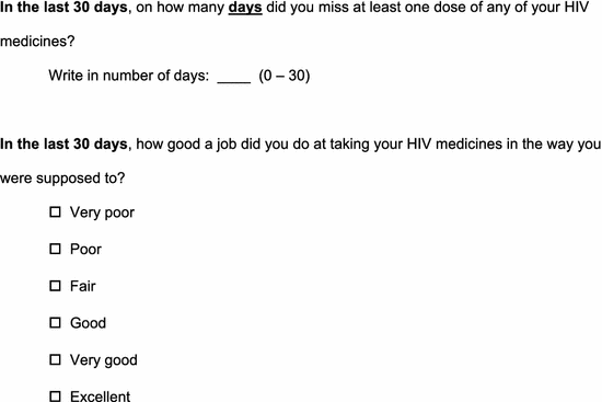 The pencil-and-paper version of the questionnaire included an item asking how many different HIV medicines the subject takes, the three adherence questions, and items about how long ago the patient first started taking antiretrovirals, gender, age, education, ethnicity, and race. For each of the three items asking about antiretroviral medication adherence, this pencil-and-paper version of the questionnaire used the phrase their “HIV medicines” which we had determined in the cognitive testing was consistently understood as referring to HIV antiretroviral medications.