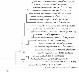 A Gram-positive, rod-shaped, motile and spore-forming bacterium, designated ZLD-8T, was isolated from a desert soil sample collected from Xinjiang Province in north-west China, and subjected to a polyphasic taxonomic analysis. This isolate grew optimally at 30°C and pH 7.0. It grew with 0–4% NaCl (optimum, 0–1%). Comparative 16S rRNA gene sequence analysis showed that strain ZLD-8T was closely related to members of the genus Bacillus, exhibiting the highest 16S rRNA gene sequence similarity to Bacillus kribbensis DSM 17871T (98.0%). The levels of 16S rRNA gene sequence similarity with respect to other Bacillus species with validly published names were less than 96.3%. The DNA G + C content of strain ZLD-8T was 40.1 mol%. The strain contained MK-7 as the predominant menaquinone. The diagnostic diamino acid in the cell-wall peptidoglycan was meso-diaminopimelic acid. The major polar lipids were diphosphatidylglycerol, phosphatidylglycerol and phosphatidylethanolamine. The major fatty acids (>5% of total fatty acids) were anteiso-C15:0 (39.56%), iso-C14:0 (25.69%), C16:1 ω7c alcohol (10.13%) and iso-C15:0 (5.27%). These chemotaxonomic results supported the affiliation of strain ZLD-8T to the genus Bacillus. However, low DNA–DNA relatedness values and distinguishing phenotypic characteristics allowed genotypic and phenotypic differentiation of strain ZLD-8T from recognized Bacillus species. On the basis of the polyphasic evidence presented, strain ZLD-8T is considered to represent a novel species of the genus Bacillus, for which the name Bacillus deserti sp. nov. is proposed. The type strain is ZLD-8T (=CCTCC AB 207173T = KCTC 13246T).