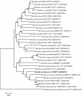 A Gram-stain positive, facultative aerobic bacterium, designated as strain GSS03T, was isolated from a paddy field soil. The cells were observed to be endospore forming, rod-shaped and motile with flagella. The organism was found to grow optimally at 35 °C at pH 7.0 and in the presence of 1 % NaCl. The strain was classified as a novel taxon within the genus Bacillus on the basis of phenotypic and phylogenetic analyses. The closest phylogenetic relatives were identified as Bacillus psychrosaccharolyticus DSM 6T (97.61 %), Bacillus muralis DSM 16288T (97.55 %), Bacillus asahii JCM 12112T (97.48 %), Bacillus simplex DSM 1321T (97.48 %) and “Bacillus frigoritolerans” DSM 8801T (97.38 %). The menaquinone was identified as MK-7, the major cellular fatty acid was identified as anteiso-C15:0 and the major cellular polar lipids as phosphatidylethanolamine, phosphatidylmonomethylethanolamine, diphosphatidylglycerol, phosphatidylglycerol and three unknown polar lipids. The DNA G+C content was determined to be 40.2 mol%. The DNA–DNA relatedness with the closest relatives was below 48 %. Therefore, on the basis of all the results, strain GSS03T is considered to represent a novel species within the genus Bacillus, for which the name Bacillus huizhouensis sp. nov. is proposed. The type strain is GSS03T (=KCTC 33172T =CCTCC AB 2013237T).