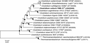 A Gram-stain positive, strict anaerobe, spore-forming, motile rod-shaped bacterial strain with peritrichous flagella, designated YMB-57T, was isolated from the intestine of a cinereous vulture (Aegypius monachus) in Korea. StrainYMB-57T was found to show optimal growth at 37 °C, pH 7.5 and 1.0 % (w/v) NaCl. Phylogenetic analysis based on the 16S rRNA gene sequence showed that strain YMB-57T belongs to the genus Clostridium and is most closely related to the type strains of Clostridium subterminale (96.9 % sequence similarity), Clostridium thiosulfatireducens (96.7 %) and Clostridium sulfidigenes (96.6 %). The main fermentation end-products identified following growth in PYG medium were acetate, butyrate, ethanol, propanol, carbon dioxide and hydrogen. Peptone was converted to ethanol, and butanol, whereas glucose was fermented to ethanol. The major cellular fatty acids were identified as C16:0, C18:1 ω9c, and C18:1 ω9c DMA and the DNA G+C content was determined to be 34.0 mol%. Phenotypic and phylogenetic differences indicate that strain YMB-57T is distinct from other Clostridium species. It is proposed that strain YMB-57T be classified as the type strain of a novel species of the genus Clostridium, with the name Clostridium vulturis sp. nov. The type strain is YMB-57T (=KCTC 15114T = JCM 17998T).
