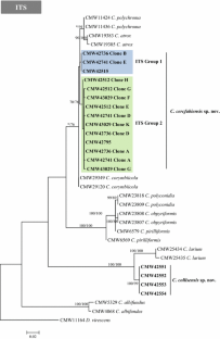 During routine surveys for possible fungal pathogens in the rapidly expanding plantations of Eucalyptus and Cunninghamia lanceolata in China, numerous isolates of unknown species in the genus Ceratocystis (Microascales) were obtained from tree wounds. In this study we identified the Ceratocystis isolates from Eucalyptus and Cunninghamia in the GuangDong, GuangXi, FuJian and HaiNan Provinces of South China based on morphology and through comparisons of DNA sequence data for the ITS, partial β-tubulin and TEF-1α gene regions. Morphological and DNA sequence comparisons revealed two previously unknown species residing in the Indo-Pacific Clade. These are described here as Ceratocystis cercfabiensis sp. nov. and Ceratocystis collisensis sp. nov. Isolates of Ceratocystis cercfabiensis showed intragenomic variation in their ITS sequences and four strains were selected for cloning of the ITS gene region. Twelve ITS haplotypes were obtained from 17 clones selected for sequencing, differing in up to seven base positions and representing two separate phylogenetic groups. This is the first evidence of multiple ITS types in isolates of Ceratocystis residing in the Indo-Pacific Clade. Caution should thus be exercised when using the ITS gene region as a barcoding marker for Ceratocystis species in this clade. This study also represents the first record of a species of Ceratocystis from Cunninghamia.