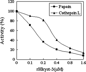 The gene encoding cystatin from the tick Haemaphysalis longicornis has been reported previously. In the study reported here, we characterized a member of cystatins and designated it as Hlcyst-3 (H. longicornis cystatin-3). Its full-length cDNA is 602 bp, and it encodes a putative 129 amino acid protein with an obvious signal peptide. Sequence analysis revealed that it has significant homology with the known secreted cystatin. The recombinant protein was expressed in a GST-fused soluble form in Escherichia coli and was purified by affinity chromatography. The inhibitory activity of the recombinant protein against papain and cathepsin L was identified by fluorogenic substrate analysis. Real-time PCR revealed that Hlcyst-3 was mostly expressed in the tick midgut.