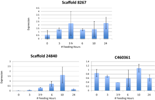 Supplementary material 17 (PPTX 1509 kb) Supplementary Figure S3: Bar graphs showing the top 35 most common species showing as the top BlastX hit for the Unfed, 3 Hr Fed, 3 Hr Frustrated, and Adult Female Pooled transcriptomes