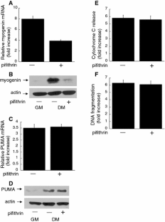 We have previously shown that when skeletal myoblasts are cultured in differentiation medium (DM), roughly 30% undergo caspase 3-dependent apoptosis rather than differentiation. Herein, we investigate the molecular mechanism responsible for the activation of caspase 3 and the ensuing apoptosis. When 23A2 myoblasts are cultured in DM, caspase 9 activity is increased and pharmacological abrogation of caspase 9 activation impairs caspase 3 activation and apoptosis. Further, we detect a time dependent release of mitochondrial cytochrome C into the cytosol in roughly 30% of myoblasts. Inclusion of cycloheximide inhibits the release of cytochrome C, the activation of caspase 9 and apoptosis. These data indicate that the mitochondrial pathway plays a role in this apoptotic process and that engagement of this pathway relies on de novo protein synthesis. Through RT-PCR and immunoblot analysis, we have determined that the expression level of the pro-apoptotic Bcl2 family member PUMA is elevated when 23A2 myoblasts are cultured in DM. Further, silencing of PUMA inhibits the release of cytochrome C and apoptosis. Signaling by the transcription factor p53 is not responsible for the increased level of PUMA. Finally, myoblasts rescued from apoptosis by either inhibition of elevated caspase 9 activity or silencing of PUMA are competent for differentiation. These results indicate a critical role for PUMA in the apoptosis associated with skeletal myoblast differentiation and that a p53-independent mechanism is responsible for the increased expression of PUMA in these cells.
