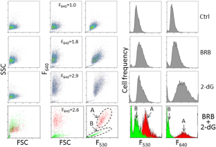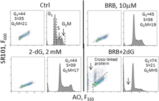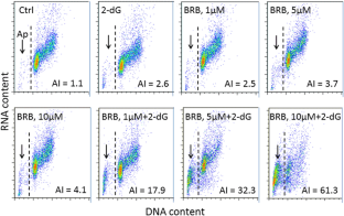 Utilizing a variety of flow cytometric methods evidence was obtained indicating that a combination of the glucose analog 2-deoxy-d-glucose (2-dG) and the plant alkaloid berberine (BRB) produces synergistic effect in the induction of apoptosis in human lymphoblastoid TK6 cells. The synergistic effect is seen at concentrations of the drugs at which each of them alone shows no cytotoxicity at all. The data suggest that the combination of these drugs, which are known in terms of their overall toxicity, side effects and pharmacokinetics may be considered for further studies as chemopreventive and cancer treatment modalities. Of interest are results indicating that rapamycin, which similarly to BRB, suppresses mTOR signaling, when combined with 2-dG shows no synergistic properties. Metformin, on other hand, requires much higher concentration to show the synergy with 2-dG. Also of interest are the findings pertaining to the methodology of the present study. Specifically, dynamic assessment of cellular viability was performed by using the DRAQ7 cell exclusion fluorochrome present in cultures from 0 to 72 h. Concurrent measurement of lysosomal proton pump using acridine orange as the probe shows activation of lysosomes in the cells treated with 2-dG or BRB alone as well as with the drugs combined. Apoptosis was assessed by measuring DNA fragmentation, cell cycle, activation of caspase-3 and tissue transglutaminase (Tgase). A novel cytometric method was developed based on analysis of lysosomal (acidic vesicles) proton pump in live cells followed by cell lysis with detergent and fluorochrome labeling of proteins and DNA to analyze Tgase activation concurrently with cell cycle, in same population of cells. The data show that the cell subpopulation undergoing apoptosis has increased side (right-angle) light scatter likely due to the presence of the crosslinked (solid state) proteins, the consequence Tgase activation.