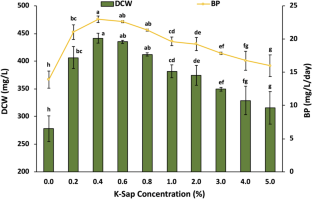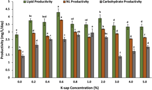 The main aim of the present study was to determine the effects of a seaweed-based biostimulant’s supplementation on the growth of Chlorella variabilis. A liquid extract from Kappaphycus alvarezii (K-sap) was prepared and supplemented in the growth medium from 0.2 to 5% concentrations. The supplementation of K-sap increased the growth and photosynthetic performance of C. variabilis. Addition of 0.4% K-sap increased the biomass production by about 59% compared to the control culture. The highest lipid and neutral lipid productivities were observed in 0.6% K-sap-supplemented culture, which were around 50 and 100% higher than that of the control culture, respectively. Addition of 1% K-sap increased the carbohydrate accumulation in the cells by about 50%. These results suggest that the supplementation of a seaweed-based biostimulant effectively enhances the growth and biofuel potential of microalgae.