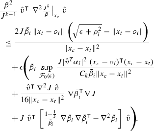 where \(\hat{v}^\intercal (x_c-o_i)=0\) and \(\sqrt{J}\) is substituted for \(\Vert x_c-x_t\Vert ^2-r_t^2\) (for brevity), since in \(\mathcal {F}_0(\epsilon )\) it holds \(\Vert x_c-x_t\Vert >r_t\).