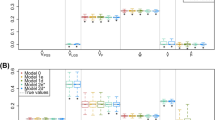 As denoted by the additional \(+g\) terms in the haplotypic PGS variances in Fig. 2, AM increases the variance within haplotypic PGS’s to the same degree as the covariance between them. The k term in the haplotypic PGS variance represents the variance of the haplotypic PGS in the base population, and is not estimated; rather, it is fixed depending on how the user scales the PGS. If the full PGS is standardized in the base population, then \(k={1\over 2}\). This value of k is useful because the increase in the variances of haplotypic genetic scores under AM is easily quantified by the degree to which it is greater than \({1\over 2}\). However, standardizing in the base population is typically impossible in real data, and so is mostly useful only in simulated data or when there is no AM (such as Model 0). In real data, the full PGS (\(T_p+T_m\)) will typically be standardized in the current generation, in which case \(k = {1\over 2}-2g\). Finally, if the haplotypic PGS is scaled in the current generation to have a variance of \({1\over 2}\), then \(k = {1\over 2}-g\). So long as the value of k is consistent with how the PGS is scaled, the estimates of other parameters will not be affected. In all cases, the variance of the full PGS (\(=var(T_m+T_p)=2k+4g\), which \(=1+4g\) if the full PGS is standardized in the base population) \(=1\) if the full PGS is standardized in the current population, and \(=1+2g\) if the haplotypic PGS is scaled to have variance \(={1\over 2}\) in the current population.