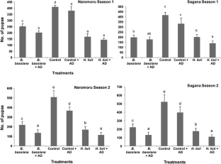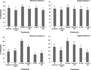 Field trials were carried out for two seasons in two sites (Sagana and Naromoru, Central province of Kenya) to evaluate the prospects of endophyte isolates of Beauveria bassiana (Balsamo) Vuillemin G1LU3 and Hypocrea lixii Patouillard F3ST1 for the control of Liriomyza leafminer in common bean Phaseolus vulgaris L. crops through seeds inoculation. Autodissemination device (AD) treated with conidia of Metarhizium anisopliae (Metschnikoff) Sorokin ICIPE 20 was also added as a treatment. Leafminer infestation was not significantly different during the first season but was higher in the controls than in endophtyte treatments at both sites during the second season. Three key Liriomyza species [(L. huidobrensis Blanchard, L. sativae Blanchard and L. trifolii (Burgess)] and six parasitoid species [(Opius dissitus Muesebeck, Phaedrotoma scabriventris Nixon, Diglyphus isaea Walker, Neochrysocharis formosa Westwood, Hemiptarsenus varicornis Girault and Halticoptera arduine (Walker)] were identified during the trials. Leafminer infestation, number of pupae, leafminer flies and parasitoids emergence and yield were the parameters evaluated. Both isolates successfully colonized different parts of P. vulgaris plants, although the colonization was higher with H. lixii F3ST1 than B. bassiana G1LU3 at both sites. The mean number of pupae from the infested leaves varied between 141–252 and 331–416 in endophyte and control treatments, respectively, during the first season and from 110–223 to 366–523, respectively, in endophyte and control treatments during the second season. There were no significant differences among the treatments in the number of parasitoids that emerged from pupae. Higher yield of P. vulgaris seeds was obtained in endophyte than in control treatments. The inclusion of AD treatment did not have significant effect on all the parameters evaluated, except yield. Results of the present study suggest that both fungal isolates hold potential for pest management and could be considered for the control of leafminer flies. However, there is the need to confirm these results on large-scale trials.