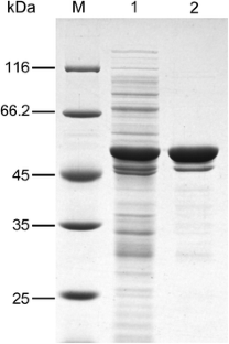 A novel glutamate decarboxylase, BmGAD, from Bacillus megaterium was overexpressed and purified. BmGAD was approximately 53 kDa by SDS-PAGE analysis. Its optimum activity was at pH 5 and 50 °C. BmGAD had a specific activity of 59 ± 5.2 U mg−1 at pH 6, which is the highest value reported so far. The apparent Km and Vmax values of BmGAD were 8 ± 0.5 mM and 150 ± 4.7 U mg−1, respectively. Through site-directed mutagenesis, two BmGAD mutants (E294R and H467A) showed higher Vmax values than that of wild-type, with the values of 210 ± 6.9 and 180 ± 4.1 U mg−1 at pH 5 and 50 °C, respectively.