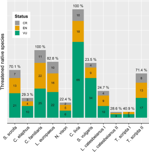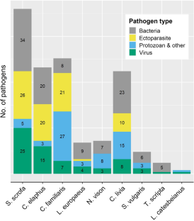 Table 1. Studied invasive alien species and pathogens potentially carried by them, type of pathogen (V: virus; B: bacteria; P: protozoan; EP: ectoparasite), epidemiological status and related disease. Under TNS are numbers of threatened native species (CR, EN, and VU) that could be at risk for pathogen transmission from each invasive species. References for table are provided in Online Resource 4 (DOCX 67 KB)