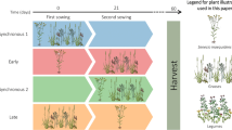 Although, total number of plants was associated with earlier germination across the whole data set, there were species dependent responses, indicating that not all species can increase their abundance dominance through phenological priority. There was no indication of any causal connection between the germination of one seed and subsequent seeds based on the total number of plants present, as has been reported in some studies of overcrowded plant communities (Bao et al. 2021). The limited responses detected in individual plant biomass in relation to germination timing indicates that plants were restricted in further growth by limiting factors (for rapid germinators) or could quickly reach maximum growth levels (after slow germination). The absence of this pattern in the mixed communities indicates that there was competition for resources. Such competition most likely takes place belowground, mediated by the microbial community or through allelopathic effects (Corbin and D'Antonio 2012), as there was no indication that overcrowding affected the number of plants, their size or biomass as shown for intra-specific competition (Ross and Harper 1972).