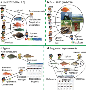 The Internet has changed the way biologists communicate; this includes the collection of information on fish biology. This technological change may allow the possibility for biological monitoring by general citizens via the Internet. The Japanese Internet atlas of fishes, WEB sakana-zukan, has been in operation since 2002. It provides an opportunity to communicate and accumulate information on fish biology by amateur users, who consist mainly of sports fishing fans. This website has functioned not only as an entertainment and educational tool for users with an environmental and ichthyological interest. To date, more than 35,000 photographs of fishes have been registered on the website by more than 1,000 unique users, and more than 37,500 photographs of fishes have been posted in its bulletin board system (linking approximately 28,000 photographs to the website) by more than 2,000 unique users. As these photographs almost always include time and locality data, it is possible to provide distribution data by publishing the information as scientific papers or registering them as collections at the Kanagawa Prefectural Museum of Natural History (the Image Database of Fishes (KPM-NR) contributing to the Global Biodiversity Information Facility). If the communication method is developed and improved, various scientists will be able to collect much more biodiversity data from general citizens via the Internet.