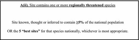 This sub-criterion is largely identical to the regional approach to IPA identification in Europe (Anderson 2002), but with two additions. First, species that have been assessed as threatened according to IUCN criteria and reviewed but have not yet been uploaded to the official global Red List are accepted as criterion A(i) species—this is a pragmatic decision because of the periodic release of reviewed species to the Red List and the resultant time lag which may otherwise delay the IPA assessment process. Second, a global population threshold for each threatened species is included for the first time; this will provide stronger evidence for the global importance of the IPA site in addition to its national importance. It also helps to align this sub-criterion to KBA criterion A (see “Alignment of IPA criteria to IUCN Key Biodiversity Areas” section).