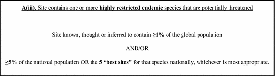Sub-criteria A(iii) and A(iv) are defined differently from those used within Europe (Anderson 2002). The corresponding European IPA sub-criteria focus on threatened national endemics and national near-endemics respectively, using political boundaries because countries are typically smaller and suitable threat data, in the form of national red lists, are often available within Europe. Beyond Europe, countries are often larger (although we acknowledge that there are also small countries in the tropics) and national red lists do not often exist.