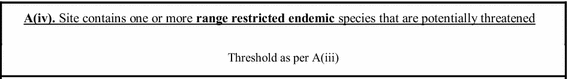 A “Highly Restricted Endemic” (HRE) is defined as a species with a total range of <100 km2. A “Range Restricted Endemic” (RRE) is defined as a species with a total range of <5000 km2 but >100 km2. These definitions of “highly restricted” and “range restricted” are aligned respectively to the CR and EN range (EOO) thresholds for IUCN threat assessments under criterion B (2012). Hence, in effect, the species are defined through partial assessment against IUCN criterion B but without the need to determine fully the threat status; it is a step towards improving the information on threatened species within these regions. Endemism is defined by ecological range size rather than by political borders, and thus A(iii) and A(iv) species can have trans-border ranges. A(iii) and A(iv) are recorded separately to allow for more detailed analysis of sites and species; they share the same thresholds.