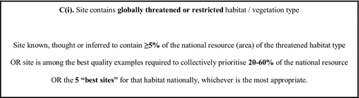 Presented below are the revised global IPA criteria; these are also summarised in Table 1. For each criterion, we present the general goal and guiding principles, then provide detail on the sub-criteria with their corresponding thresholds and notes on their application. We also record how each of the revised sub-criteria relate to the original European IPA criteria set out in the IPA site selection manual (Anderson 2002). Additional information of relevance to the identification and documentation of IPAs can be found in that publication and it is the intention of Plantlife International and Kew to update this manual based on the revised criteria presented here.